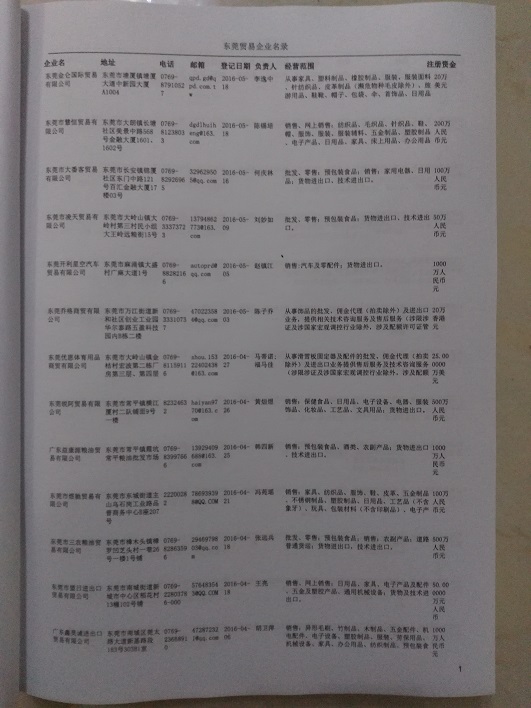 2021版最新東莞企業(yè)黃頁包括《東莞制造企業(yè)黃頁》、《東莞貿(mào)易企業(yè)黃頁》、《東莞民營企業(yè)黃頁》、《東莞外資企業(yè)黃頁》、《東莞外貿(mào)企業(yè)黃頁》共五冊,現(xiàn)優(yōu)惠價:280元/冊。每冊內(nèi)容包括:單位名稱、地址、郵編、電話、傳真、郵箱、經(jīng)營范圍等;東莞企業(yè)黃頁涵蓋了近幾年來最新成立的、有一定規(guī)模的企業(yè),具有非常高的營銷價值。有了這套黃頁開展業(yè)務也有了針對性,也省去了盲目去尋找客戶名單而浪費的時間了,工作效率也會有很大的提高。歡迎需要東莞企業(yè)黃頁的朋友及時聯(lián)系我們!