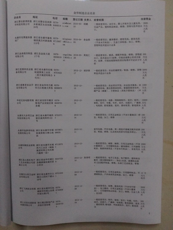 2021版最新金華企業(yè)黃頁包括《金華制造企業(yè)黃頁》、《金華貿(mào)易企業(yè)黃頁》、《金華民營(yíng)企業(yè)黃頁》、《金華外資企業(yè)黃頁》、《金華外貿(mào)企業(yè)黃頁》共五冊(cè),現(xiàn)優(yōu)惠價(jià):280元/冊(cè)。每?jī)?cè)內(nèi)容包括:?jiǎn)挝幻Q、地址、郵編、電話、傳真、郵箱、經(jīng)營(yíng)范圍等;金華企業(yè)黃頁涵蓋了近幾年來最新成立的、有一定規(guī)模的企業(yè),具有非常高的營(yíng)銷價(jià)值。有了這套黃頁開展業(yè)務(wù)也有了針對(duì)性,也省去了盲目去尋找客戶名單而浪費(fèi)的時(shí)間了,工作效率也會(huì)有很大的提高。歡迎需要金華企業(yè)黃頁的朋友及時(shí)聯(lián)系我們!