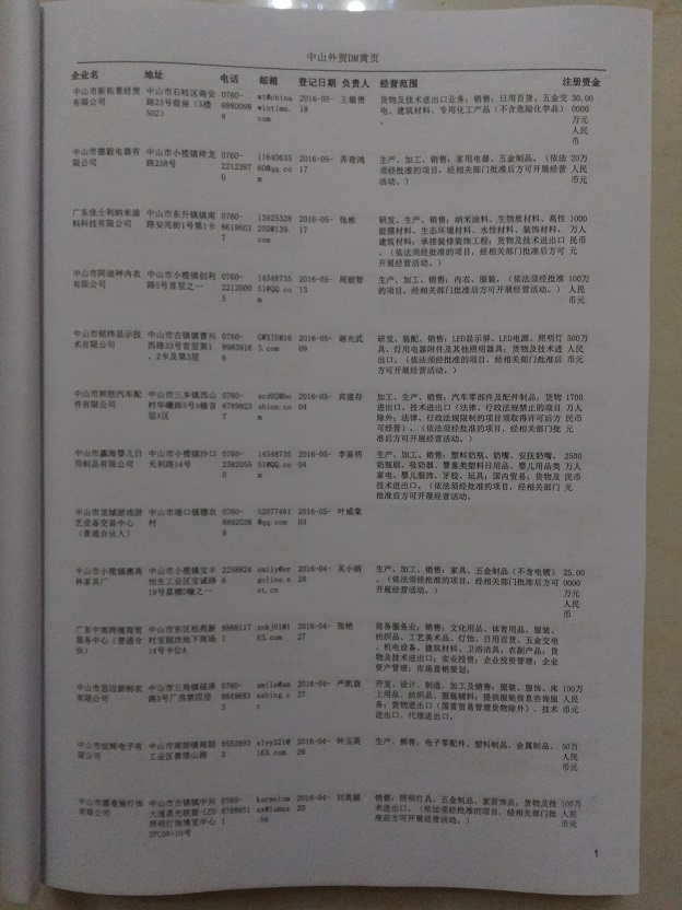 2021版最新中山企業(yè)黃頁包括《中山制造企業(yè)黃頁》、《中山貿(mào)易企業(yè)黃頁》、《中山民營(yíng)企業(yè)黃頁》、《中山外資企業(yè)黃頁》、《中山外貿(mào)企業(yè)黃頁》共五冊(cè),現(xiàn)優(yōu)惠價(jià):280元/冊(cè)。每?jī)?cè)內(nèi)容包括:?jiǎn)挝幻Q、地址、郵編、電話、傳真、郵箱、經(jīng)營(yíng)范圍等;中山企業(yè)黃頁涵蓋了近幾年來最新成立的、有一定規(guī)模的企業(yè),具有非常高的營(yíng)銷價(jià)值。有了這套黃頁開展業(yè)務(wù)也有了針對(duì)性,也省去了盲目去尋找客戶名單而浪費(fèi)的時(shí)間了,工作效率也會(huì)有很大的提高。歡迎需要中山企業(yè)黃頁的朋友及時(shí)聯(lián)系我們!