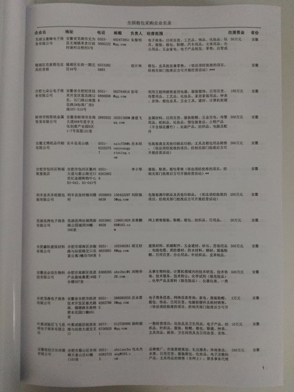 2025年新版中國箱包采購企業(yè)黃頁,收錄了全國各地經營范圍涉及箱包產品的貿易企業(yè),這些都是頗具實力的箱包產品的中國采購商。黃頁內容包含:企業(yè)名稱、地址、電話、傳真、郵箱、經營范圍、省份、注冊資金等信息。該套黃頁包含一個黃頁光碟加一冊紙質書刊,全國價格:1500元,省/直轄市價格:400元,城市價格:200元,共收錄了全國各地大概2542(統(tǒng)計日期:2018.1)家箱包產品采購企業(yè)。黃頁光碟中是EXCEL格式,信息可任意修改、復制、打印、導出及導入到傳真、郵件群發(fā)等軟件中,無任何限制。