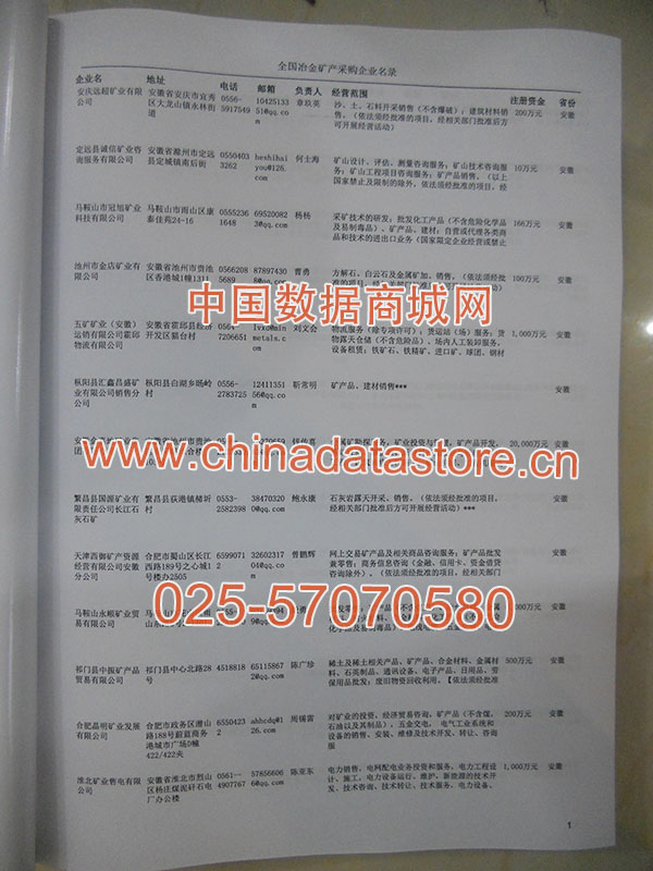 2025年新版中國(guó)冶金礦產(chǎn)采購(gòu)企業(yè)黃頁,收錄了全國(guó)各地經(jīng)營(yíng)范圍涉及冶金礦產(chǎn)產(chǎn)品的貿(mào)易企業(yè),這些都是頗具實(shí)力的冶金礦產(chǎn)產(chǎn)品的中國(guó)采購(gòu)商。黃頁內(nèi)容包含:企業(yè)名稱、地址、電話、傳真、郵箱、經(jīng)營(yíng)范圍、省份、注冊(cè)資金等信息。該套黃頁包含一個(gè)黃頁光碟加一冊(cè)紙質(zhì)書刊,全國(guó)價(jià)格:1500元,省/直轄市價(jià)格:400元,城市價(jià)格:200元,共收錄了全國(guó)各地大概8042(統(tǒng)計(jì)日期:2018.1)家冶金礦產(chǎn)產(chǎn)品采購(gòu)企業(yè)。黃頁光碟中是EXCEL格式,信息可任意修改、復(fù)制、打印、導(dǎo)出及導(dǎo)入到傳真、郵件群發(fā)等軟件中,無任何限制。