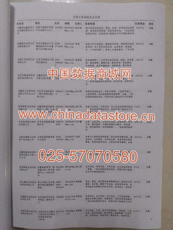 2025年新版中國(guó)文體戶外采購(gòu)企業(yè)黃頁(yè),收錄了全國(guó)各地經(jīng)營(yíng)范圍涉及文體戶外產(chǎn)品的貿(mào)易企業(yè),這些都是頗具實(shí)力的文體戶外產(chǎn)品的中國(guó)采購(gòu)商。黃頁(yè)內(nèi)容包含:企業(yè)名稱、地址、電話、傳真、郵箱、經(jīng)營(yíng)范圍、省份、注冊(cè)資金等信息。該套黃頁(yè)包含一個(gè)黃頁(yè)光碟加一冊(cè)紙質(zhì)書(shū)刊,全國(guó)價(jià)格:1500元,省/直轄市價(jià)格:400元,城市價(jià)格:200元,共收錄了全國(guó)各地大概849(統(tǒng)計(jì)日期:2018.1)家文體戶外產(chǎn)品采購(gòu)企業(yè)。黃頁(yè)光碟中是EXCEL格式,信息可任意修改、復(fù)制、打印、導(dǎo)出及導(dǎo)入到傳真、郵件群發(fā)等軟件中,無(wú)任何限制。
