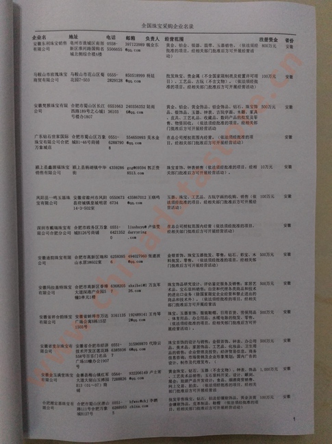 2025年新版中國珠寶采購企業(yè)黃頁,收錄了全國各地經營范圍涉及珠寶產品的貿易企業(yè),這些都是頗具實力的珠寶產品的中國采購商。黃頁內容包含:企業(yè)名稱、地址、電話、傳真、郵箱、經營范圍、省份、注冊資金等信息。該套黃頁包含一個黃頁光碟加一冊紙質書刊,全國價格:1500元,省/直轄市價格:400元,城市價格:200元,共收錄了全國各地大概4944763(統(tǒng)計日期:2018.1)家珠寶產品采購企業(yè)。黃頁光碟中是EXCEL格式,信息可任意修改、復制、打印、導出及導入到傳真、郵件群發(fā)等軟件中,無任何限制。