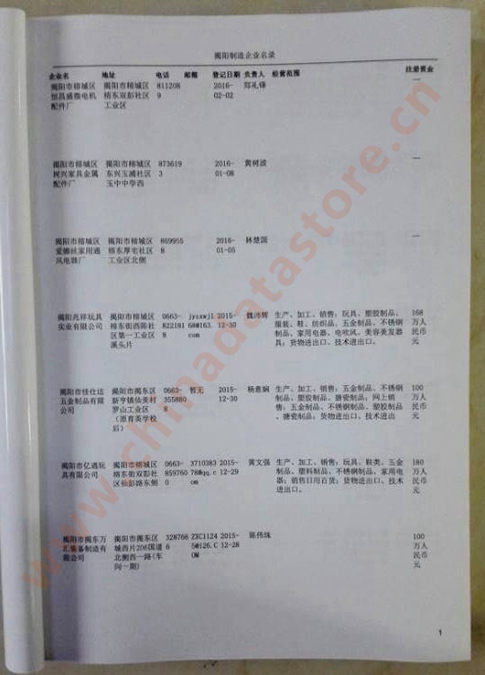 2021版最新揭陽企業(yè)黃頁包括《揭陽制造企業(yè)黃頁》、《揭陽民營企業(yè)黃頁》,現(xiàn)優(yōu)惠價:280元/冊。每冊內(nèi)容包括:單位名稱、地址、郵編、電話、傳真、郵箱、經(jīng)營范圍等;揭陽企業(yè)黃頁涵蓋了近幾年來最新成立的、有一定規(guī)模的企業(yè),具有非常高的營銷價值。有了這套黃頁開展業(yè)務也有了針對性,也省去了盲目去尋找客戶名單而浪費的時間了,工作效率也會有很大的提高。歡迎需要揭陽企業(yè)黃頁的朋友及時聯(lián)系我們!