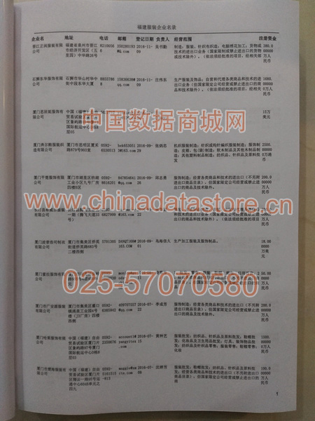 最新福建服裝生產(chǎn)與貿(mào)易企業(yè)黃頁(yè)數(shù)據(jù)更新日期2025年12月最新,福建服裝企業(yè)黃頁(yè),都是具有一定規(guī)模的福建服裝行業(yè)的注冊(cè)實(shí)體企業(yè),數(shù)據(jù)準(zhǔn)確率高,是您開展各項(xiàng)營(yíng)銷活動(dòng)的必備資料。企業(yè)名單包括:企業(yè)名稱、地址、電話(以上必有,以下選有)、傳真、郵箱、登記日期、經(jīng)營(yíng)范圍、注冊(cè)資金等信息。福建服裝企業(yè)黃頁(yè)數(shù)據(jù)為Excel格式,信息可任意修改、復(fù)制、打印、導(dǎo)出及導(dǎo)入到傳真、郵件群發(fā)等軟件中,無任何限制。