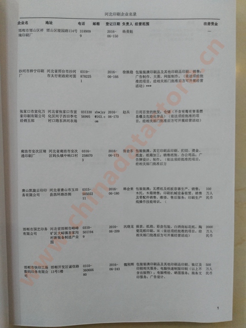 最新河北印刷生產(chǎn)與貿(mào)易企業(yè)黃頁(yè)數(shù)據(jù)更新日期2025年12月最新,河北印刷企業(yè)黃頁(yè),都是具有一定規(guī)模的河北印刷行業(yè)的注冊(cè)實(shí)體企業(yè),數(shù)據(jù)準(zhǔn)確率高,是您開(kāi)展各項(xiàng)營(yíng)銷(xiāo)活動(dòng)的必備資料。企業(yè)名單包括:企業(yè)名稱(chēng)、地址、電話(huà)(以上必有,以下選有)、傳真、郵箱、登記日期、經(jīng)營(yíng)范圍、注冊(cè)資金等信息。河北印刷企業(yè)黃頁(yè)數(shù)據(jù)為Excel格式,信息可任意修改、復(fù)制、打印、導(dǎo)出及導(dǎo)入到傳真、郵件群發(fā)等軟件中,無(wú)任何限制。