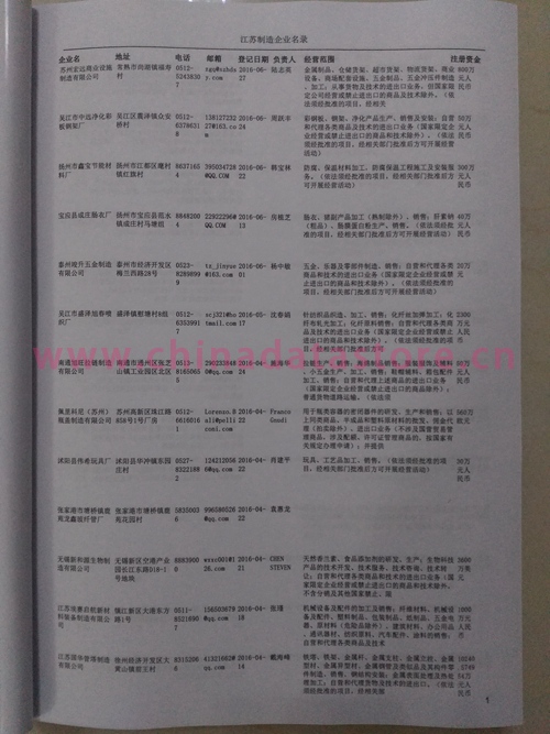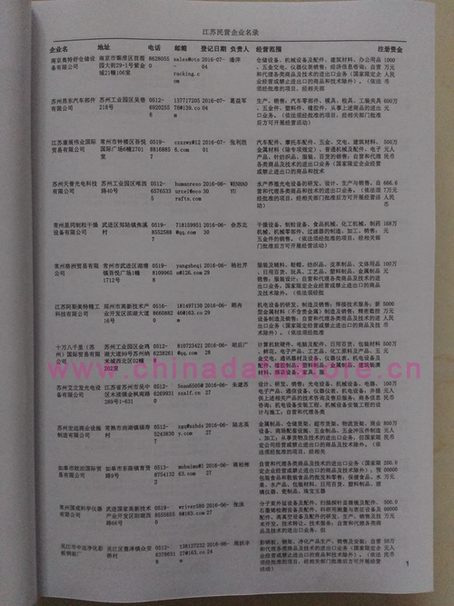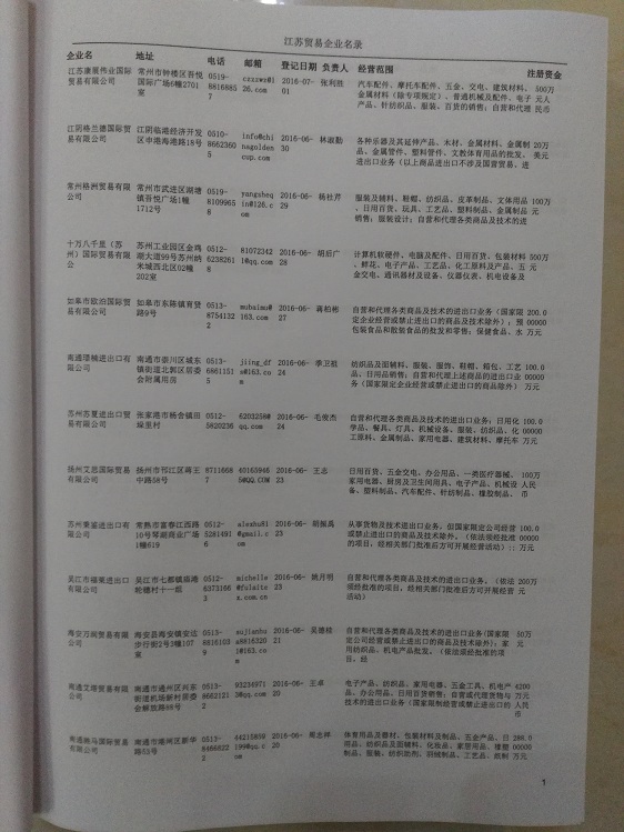2021版最新江蘇企業(yè)黃頁包括《江蘇制造企業(yè)黃頁》、《江蘇貿(mào)易企業(yè)黃頁》、《江蘇民營企業(yè)黃頁》共三冊,優(yōu)惠價:280元/冊。每冊內(nèi)容包括:單位名稱、地址、郵編、電話、傳真、郵箱、經(jīng)營范圍等;江蘇企業(yè)黃頁涵蓋了近幾年來最新成立的、有一定規(guī)模的企業(yè),具有非常高的營銷價值。有了這套黃頁開展業(yè)務也有了針對性,也省去了盲目去尋找客戶名單而浪費的時間了,工作效率也會有很大的提高。歡迎需要江蘇企業(yè)黃頁的朋友及時聯(lián)系我們!