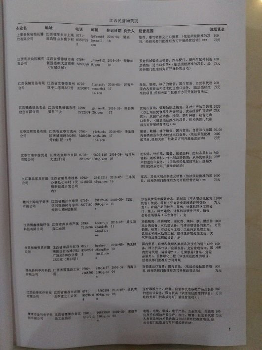 2021版最新江西企業(yè)黃頁包括《江西制造企業(yè)黃頁》、《江西貿(mào)易企業(yè)黃頁》、《江西民營企業(yè)黃頁》共三冊,優(yōu)惠價:280元/冊。每冊內(nèi)容包括:單位名稱、地址、郵編、電話、傳真、郵箱、經(jīng)營范圍等;江西企業(yè)黃頁涵蓋了近幾年來最新成立的、有一定規(guī)模的企業(yè),具有非常高的營銷價值。有了這套黃頁開展業(yè)務也有了針對性,也省去了盲目去尋找客戶名單而浪費的時間了,工作效率也會有很大的提高。歡迎需要江西企業(yè)黃頁的朋友及時聯(lián)系我們!