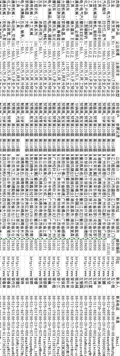 120屆廣交會(huì)參展商黃頁數(shù)據(jù)為Excel格式,信息可任意修改、復(fù)制、打印、導(dǎo)出及導(dǎo)入到傳真、郵件群發(fā)等軟件中,無任何限制。