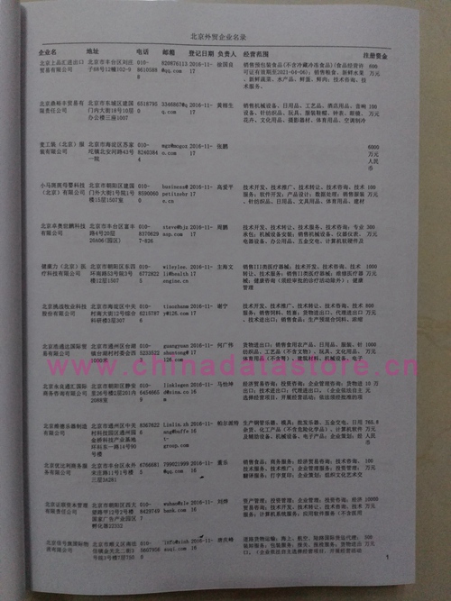 北京外貿(mào)企業(yè)黃頁包括:外貿(mào)企業(yè)名稱、地址、電話、傳真、郵箱、經(jīng)營(yíng)范圍、注冊(cè)資金等信息。