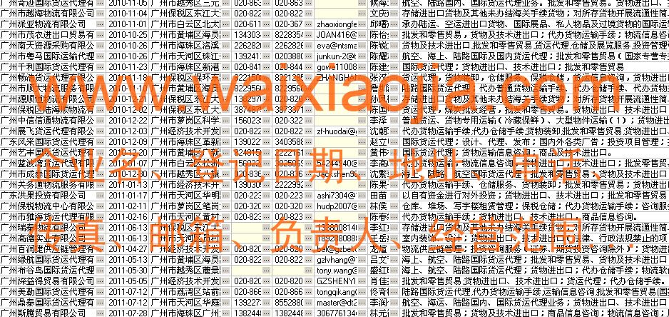廣州貨運代理公司名單數(shù)據(jù)為Excel格式,信息可任意修改、復(fù)制、打印、導(dǎo)出及導(dǎo)入到傳真、郵件群發(fā)等軟件中,無任何限制。