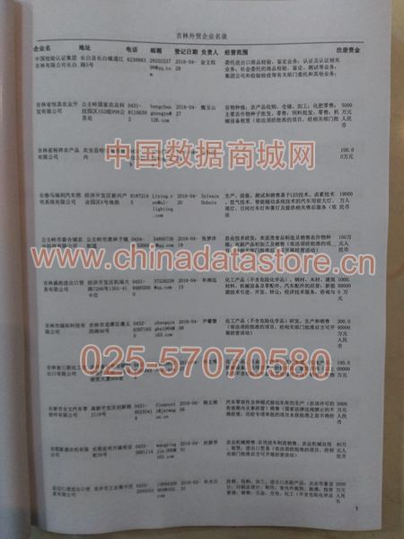 吉林外貿(mào)企業(yè)黃頁包括:外貿(mào)企業(yè)名稱、地址、電話、傳真、郵箱、經(jīng)營范圍、注冊資金等信息。