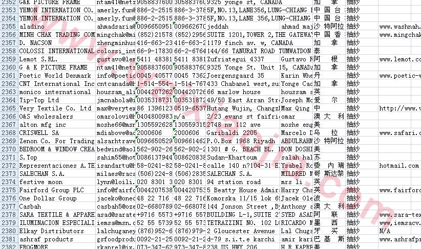 抽紗采購(gòu)商名單數(shù)據(jù)為Excel格式,信息可任意修改、復(fù)制、打印、導(dǎo)出及導(dǎo)入到傳真、郵件群發(fā)等軟件中,無(wú)任何限制。
