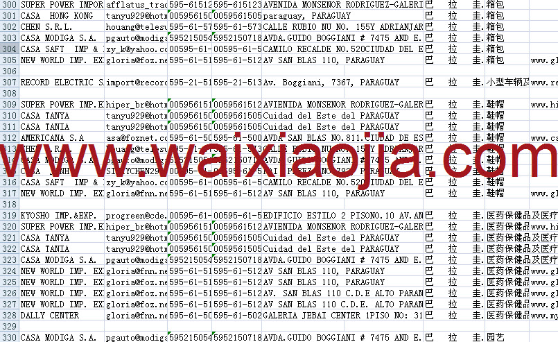巴拉圭采購商名單數(shù)據(jù)為Excel格式,信息可任意修改、復(fù)制、打印、導(dǎo)出及導(dǎo)入到傳真、郵件群發(fā)等軟件中,無任何限制。